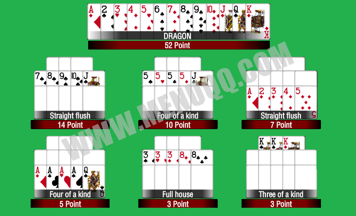 – STRAIGHT FLUSH di susunan tengah akan mendapatkan 14 point.